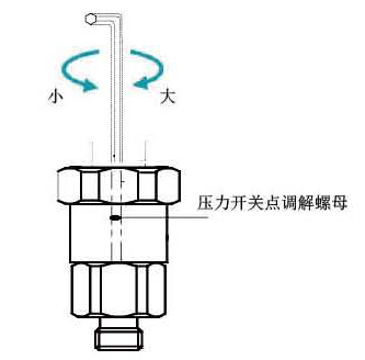第二步:參照上圖螺絲刀調(diào)解壓力開關(guān)點(diǎn)大小,順時針方向調(diào)大,逆時針方向調(diào)小。